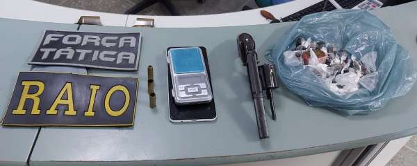A dupla autorizou a entrada na residência, onde foram feitas buscas e um revólver calibre 38, com três munições, sendo uma intacta e duas deflagradas, foi encontrado. Também foram apreendidas cinco gramas de cocaína, 45 gramas de maconha, além de um aparelho celular e uma balança de precisão, que estavam no imóvel.